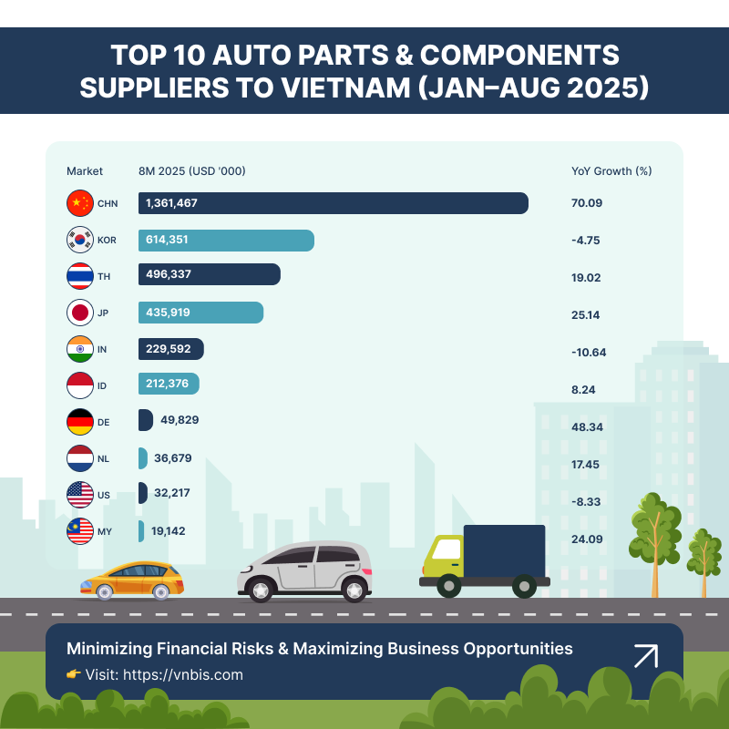 These companies account for a significant share of Vietnam’s total auto parts import value, underscoring their central role in domestic assembly and supply chains.